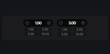 Each bet amount is configured separately. The (+) and (-) buttons adjust the bet in small increments, while buttons with fixed values add corresponding amounts. Pressing the green "Bet" button activates the bet.